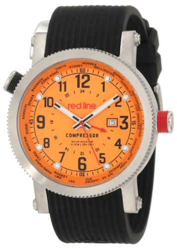 Orange dial with silver tone, white and black hands, black Arabic numerals and red second hand; luminous; stainless steel coin edge bezel; rotating inner bezel with world function; stainless steel crown with red accent..red line Men's RL-18003-06BK Compressor World Time Orange Dial Black Silicone Watch Features.
